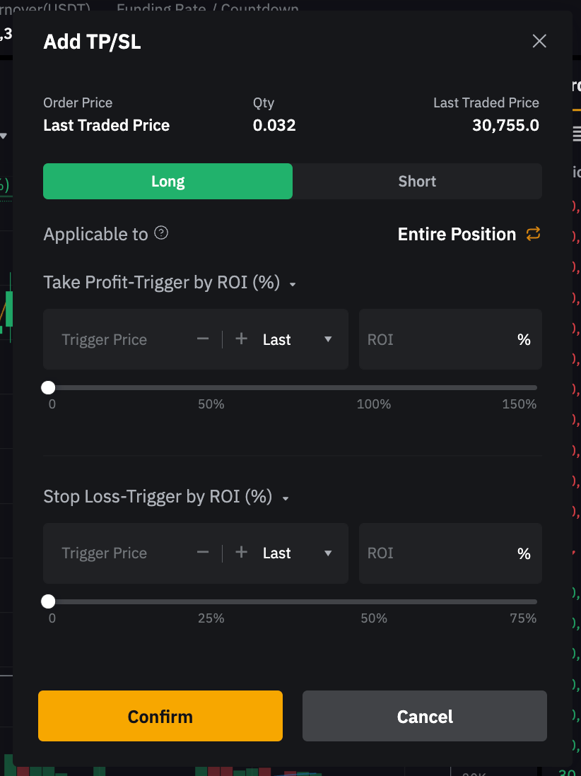 – By setting TP/SL by ROI%, you enter your desired ROI (%) and the system will calculate the TP/SL trigger price based on your ROI (%) and reference price (Last, Index or Mark Price).