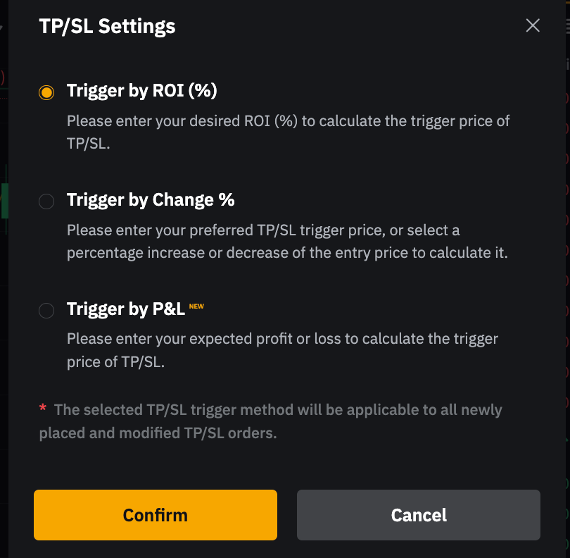Choose whether you want to take profit or stop loss by ROI%, Change % or P&L.