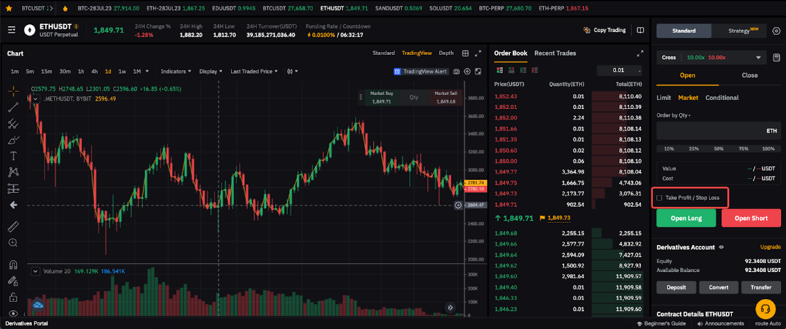 Step 1: To set TP/SL at the same time as order placement, please enter your order quantity and check the Take Profit / Stop Loss box in the order zone.