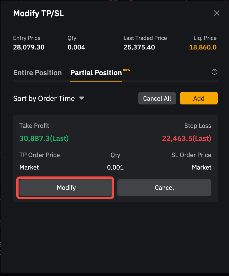 Select your preferred TP/SL mode: Entire Position or Partial Position