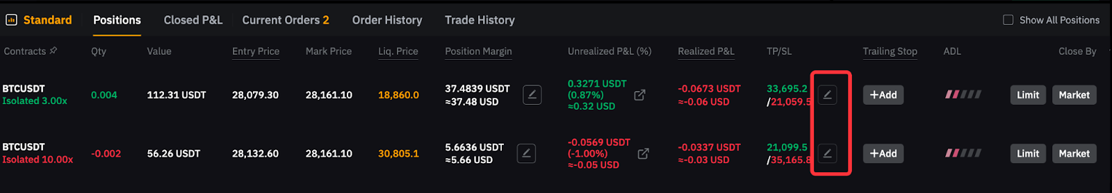 Step 1: Click on the Edit icon beside your position’s TP/SL as shown below.
