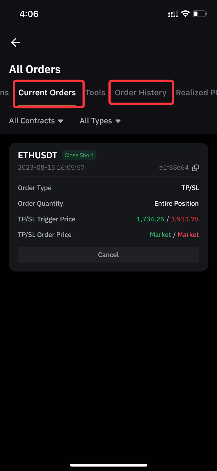 Для не активированных ордеров TP/SL вы можете проверить записи текущих ордеров, а для уже сработавших или отмененных TP/SL ордеров вы можете взглянуть на историю ордеров.