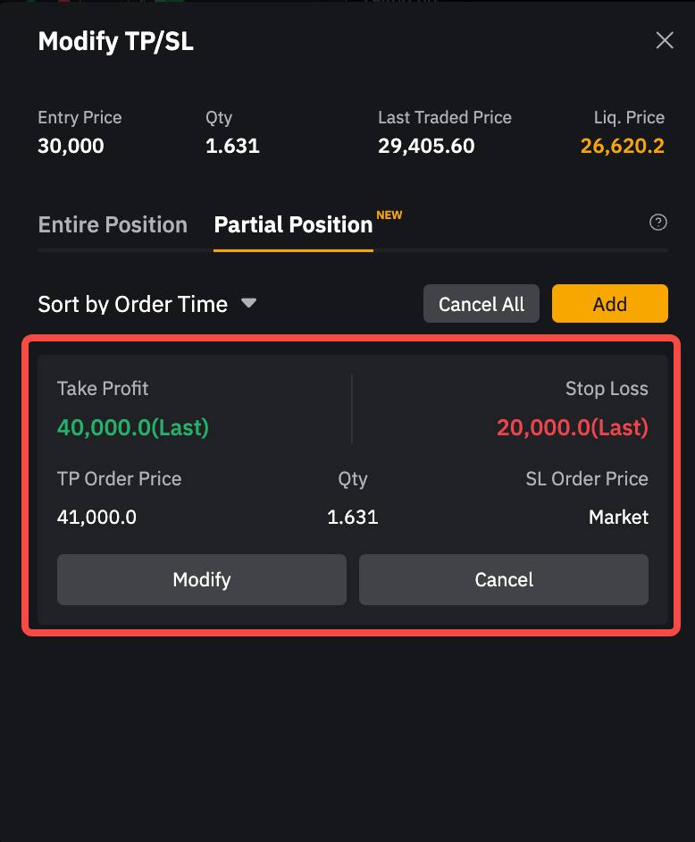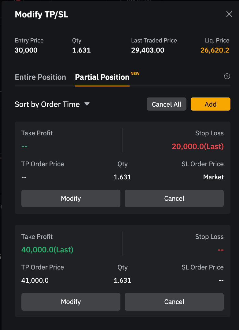 1. Для всей позиции: TP/SL применяется ко всей позиции. Трейдеры могут разместить один TP/SL ордер для одной позиции. При достижении триггерной цены тейк-профита (или стоп-лосса) вся позиция будет закрыта по рыночному ордеру.