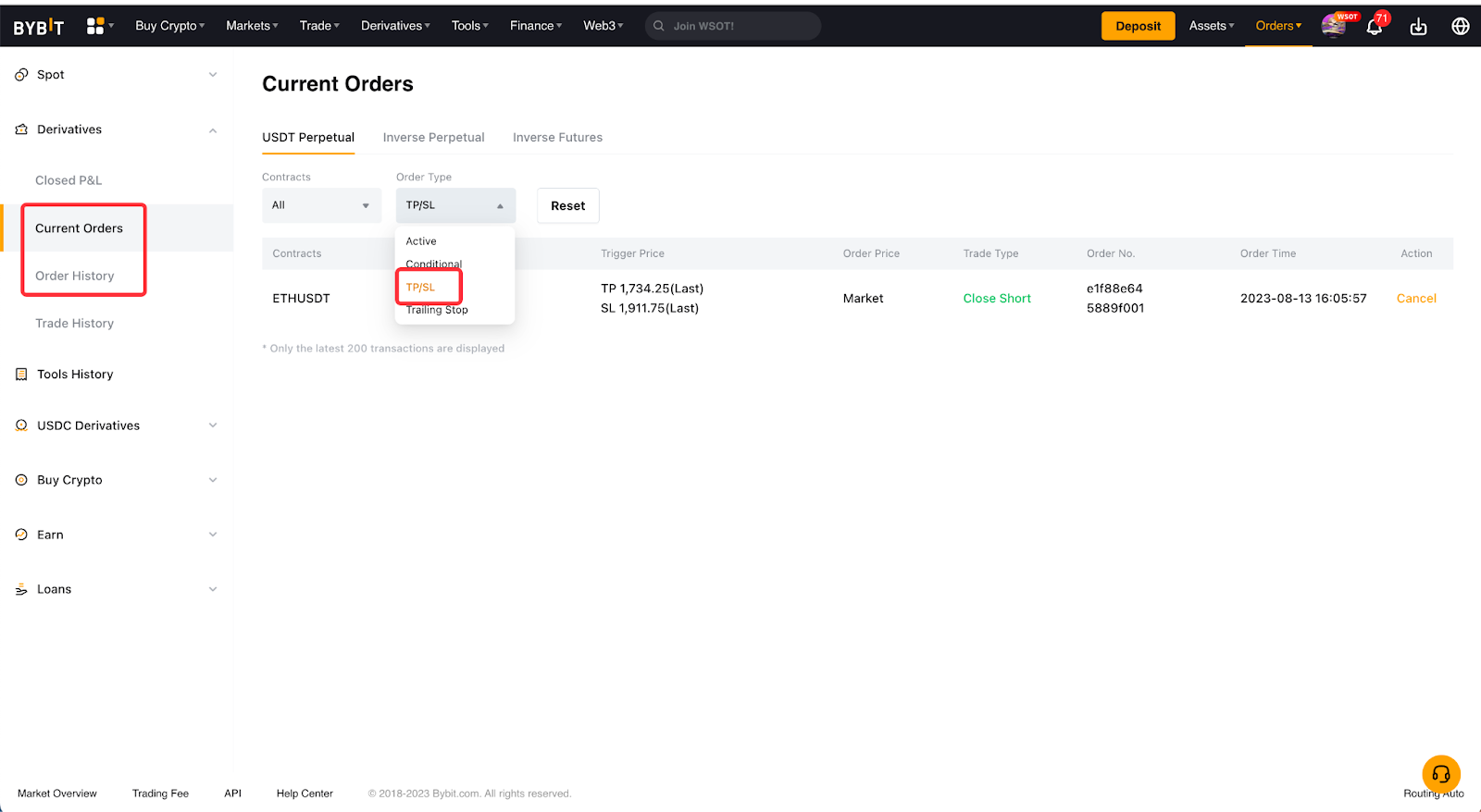 Как проверить мои текущие ордера TP/SL и историю ордеров?