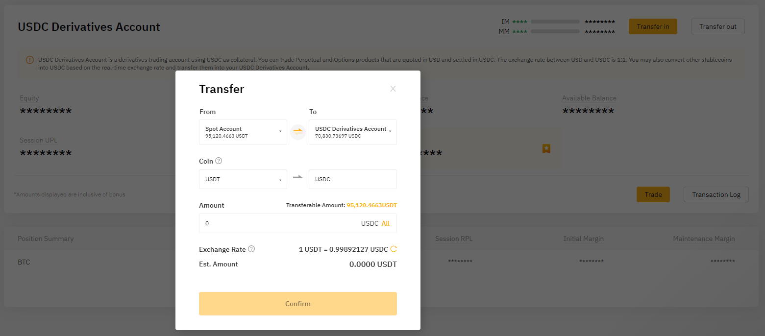Войдите в деривативный USDC аккаунт и нажмите Перевести на, чтобы перевести USDC со спотового аккаунта на деривативный USDC аккаунт.