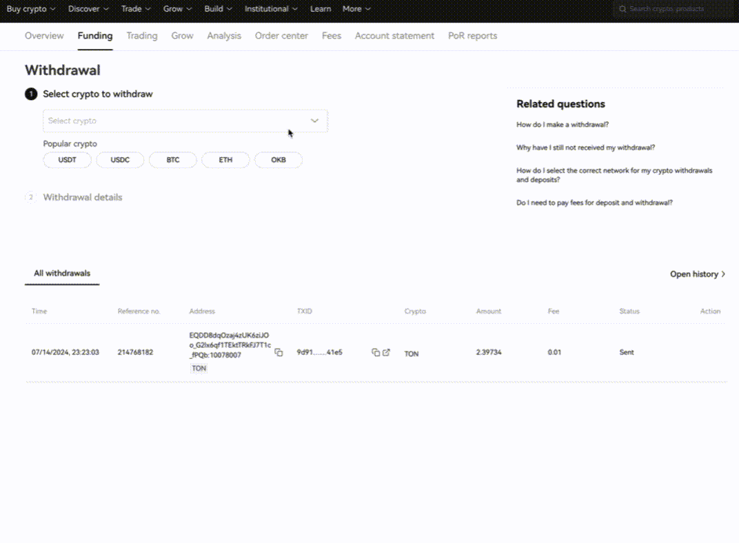 — Депозиттік тег/мемо талап ететін монета депозиттері үшін, XRP, EOS, TON тізбегі және т.б, ақшаны алу туралы сұрау бетіндегі Түсініктеме/Ескертпе/Ескертпе жолында депозит туралы жазбаны/тегті дұрыс толтыруды ұмытпаңыз. Төменде көрсетілгендей депозит терезесінен жазбаңызды/тегіңізді таба аласыз. Жазбасыз/белгісіз немесе қате меморандум/тегпен депозит салу активтерді жоғалтуға әкелуі мүмкін. Қосымша ақпаратты мына жерден қараңыз Жиі қойылатын сұрақтар — желідегі криптографиялық депозиттер.