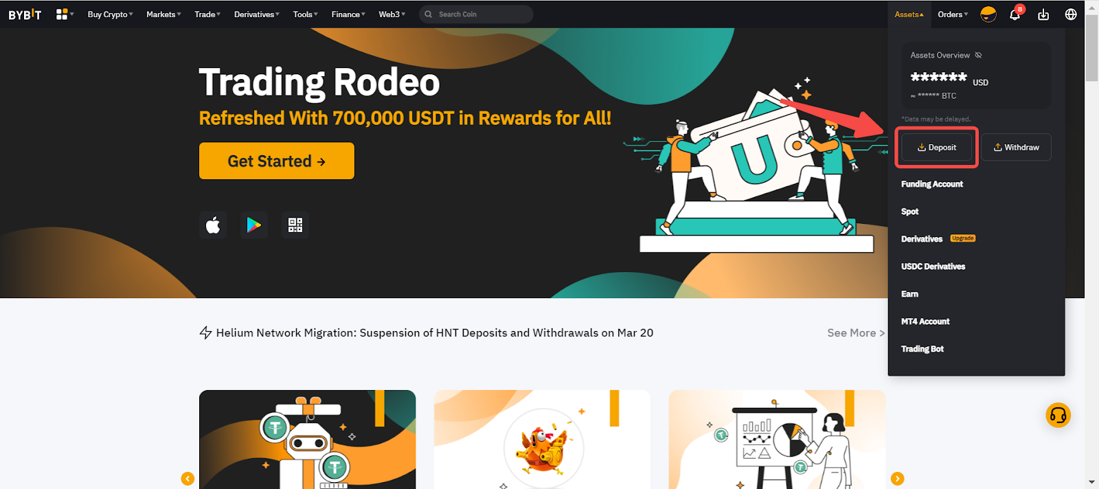 1-қадам: Курсорды үстіне апарыңыз Активтер Bybit Kazakhstan басты бетінің жоғарғы оң жақ бұрышында. Содан кейін басыңыз Депозит депозит бетіне кіру үшін.