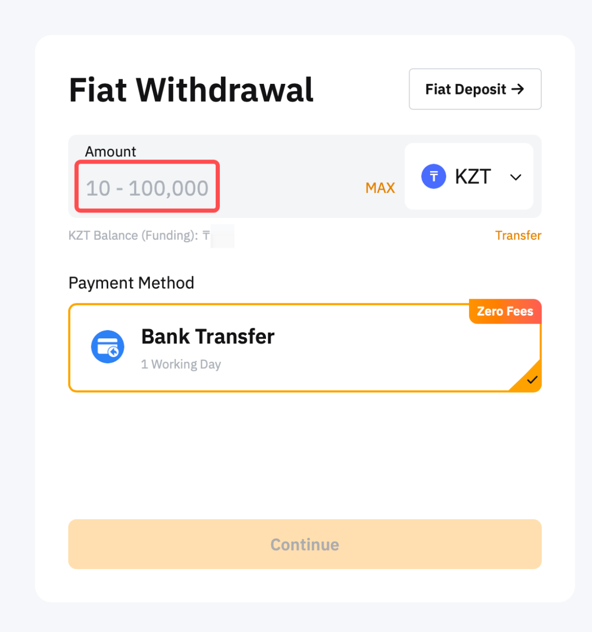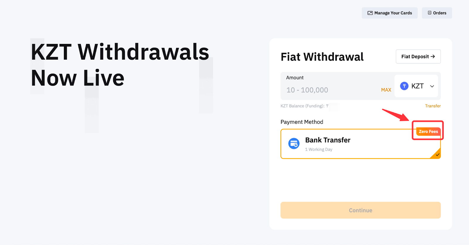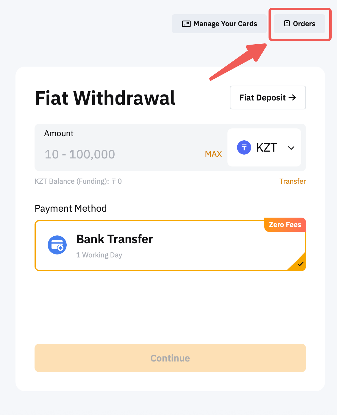 Чтобы просмотреть историю снятия средств fiat, нажмите «Заказы» в правом верхнем углу страницы снятия средств Fiat.