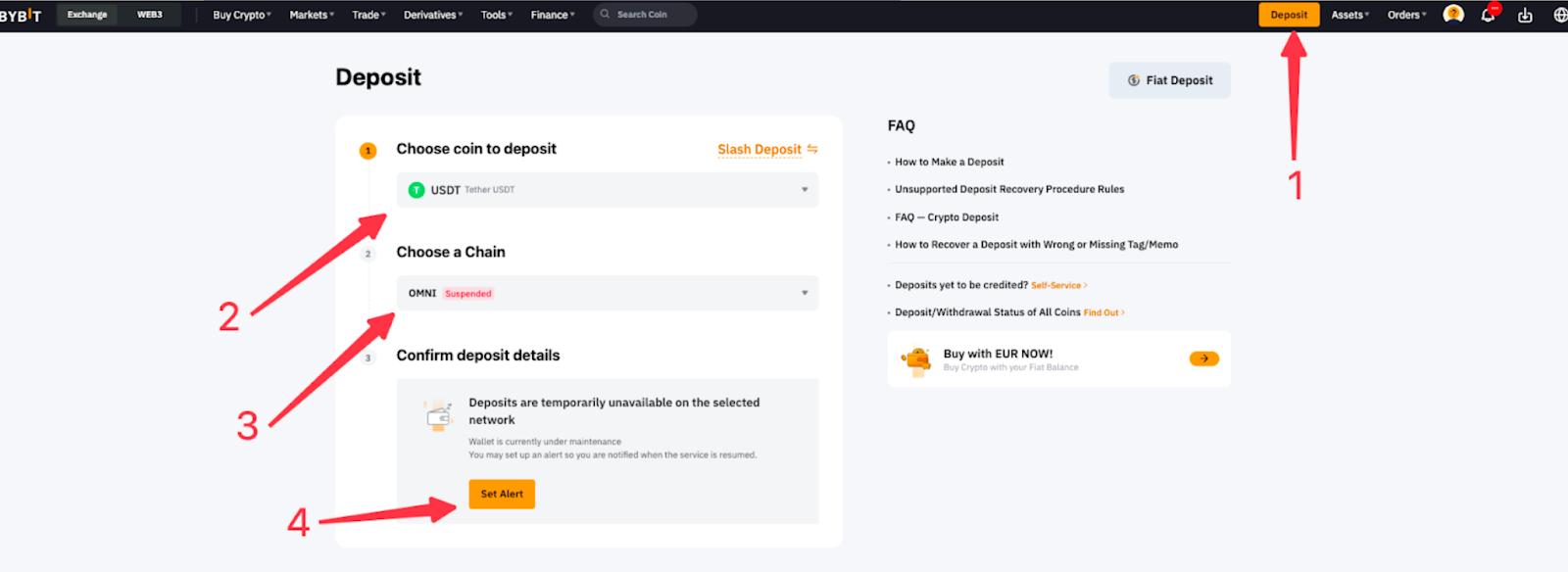 Alternatively, you can also locate the Deposit entrance in the upper right corner of the Bybit Kazakhstan page.