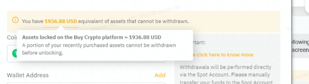 In the case that risk or abnormalities are detected in your account, the purchased assets via Buy Crypto will be temporarily locked for withdrawal. You will see the pop-up notification below if your assets are locked on the Buy Crypto platform.