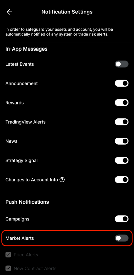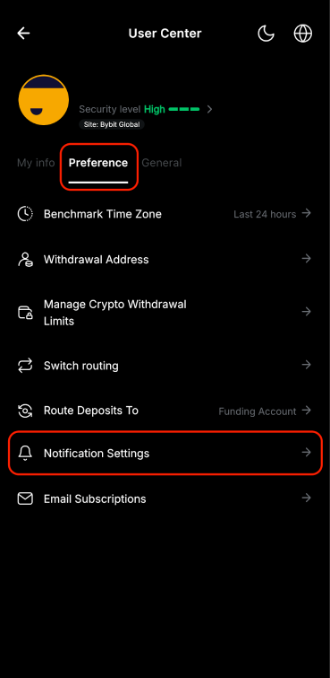 To turn off Bybit Kazakhstan’s Market Alerts, you can go to the Settings page by clicking on the profile icon on the top left corner of the homepage and click on the Settings icon. Then, click on Preference → Notification Settings where you can define the type of notifications you want to receive on your phone from the Bybit Kazakhstan App.