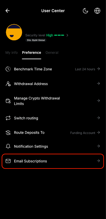 To turn off Bybit Kazakhstan’s Email Subscription, you may go to the Settings page by clicking on the profile icon on the top left corner of the homepage and click on the Settings icon. Then, click on Preferences → Email Subscriptions where you can customize which Event Reminders and General Announcements you wish to receive on your registered email address.