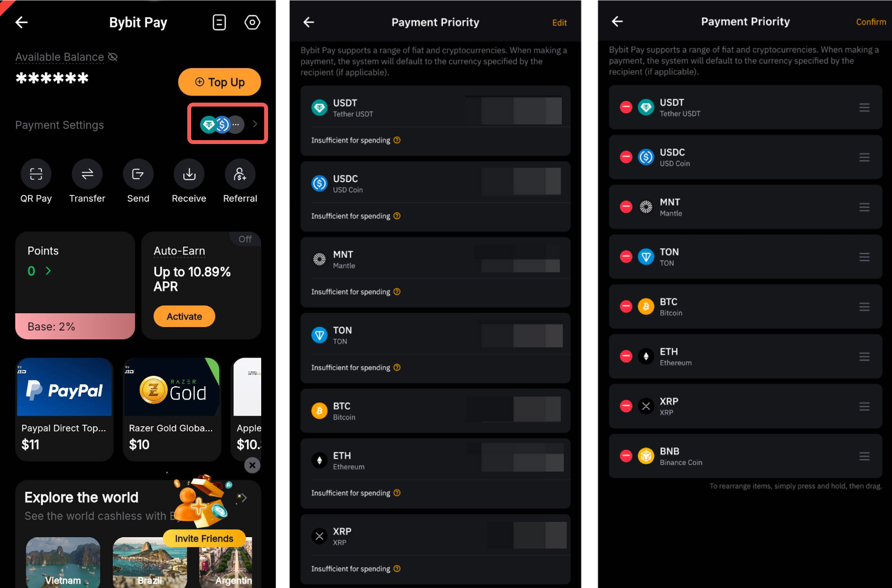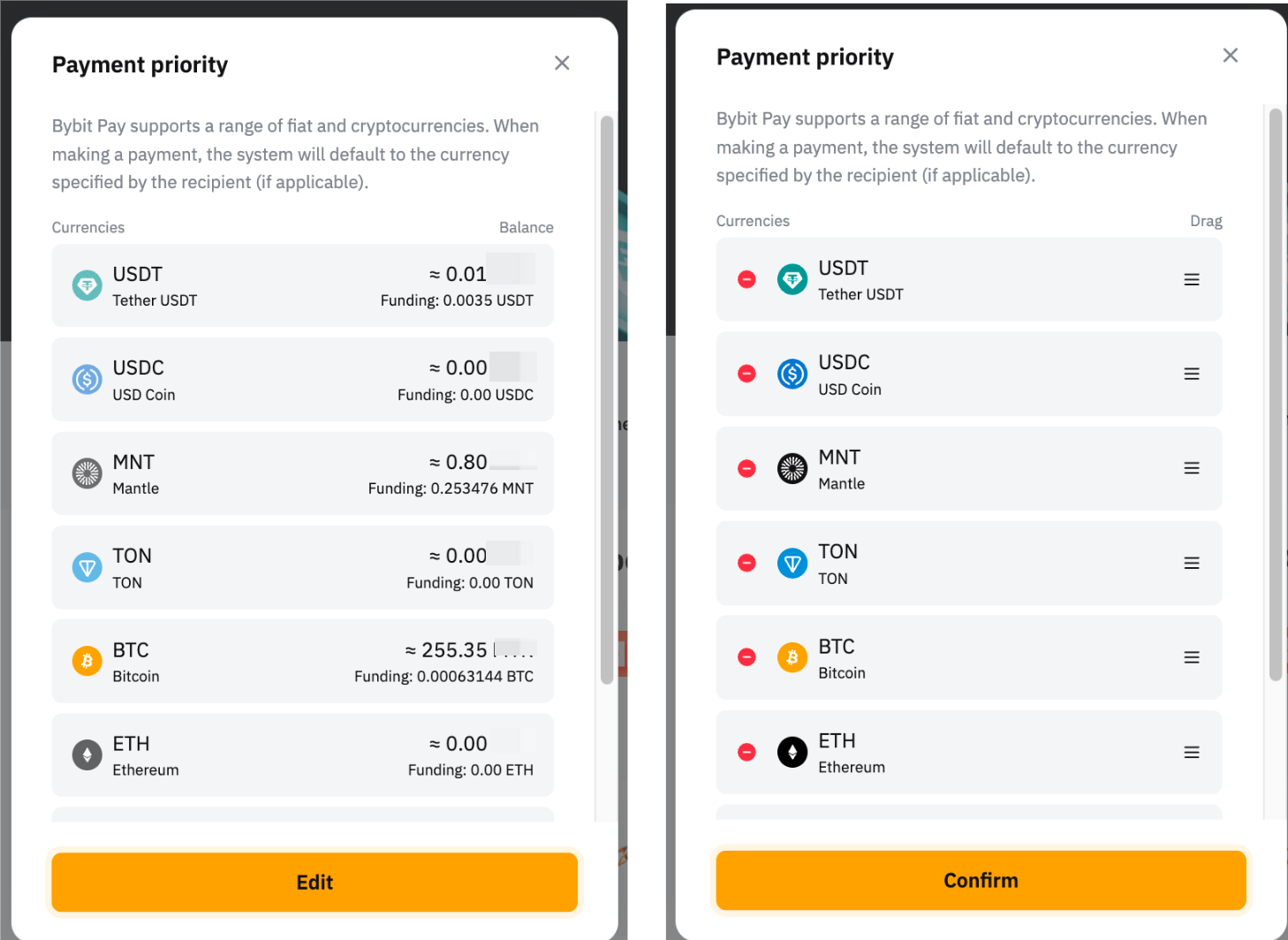 Go to Bybit Pay Kazakhstan page → Payment Priority → Edit → Tap on the remove/add button, and drag to adjust the sequences.