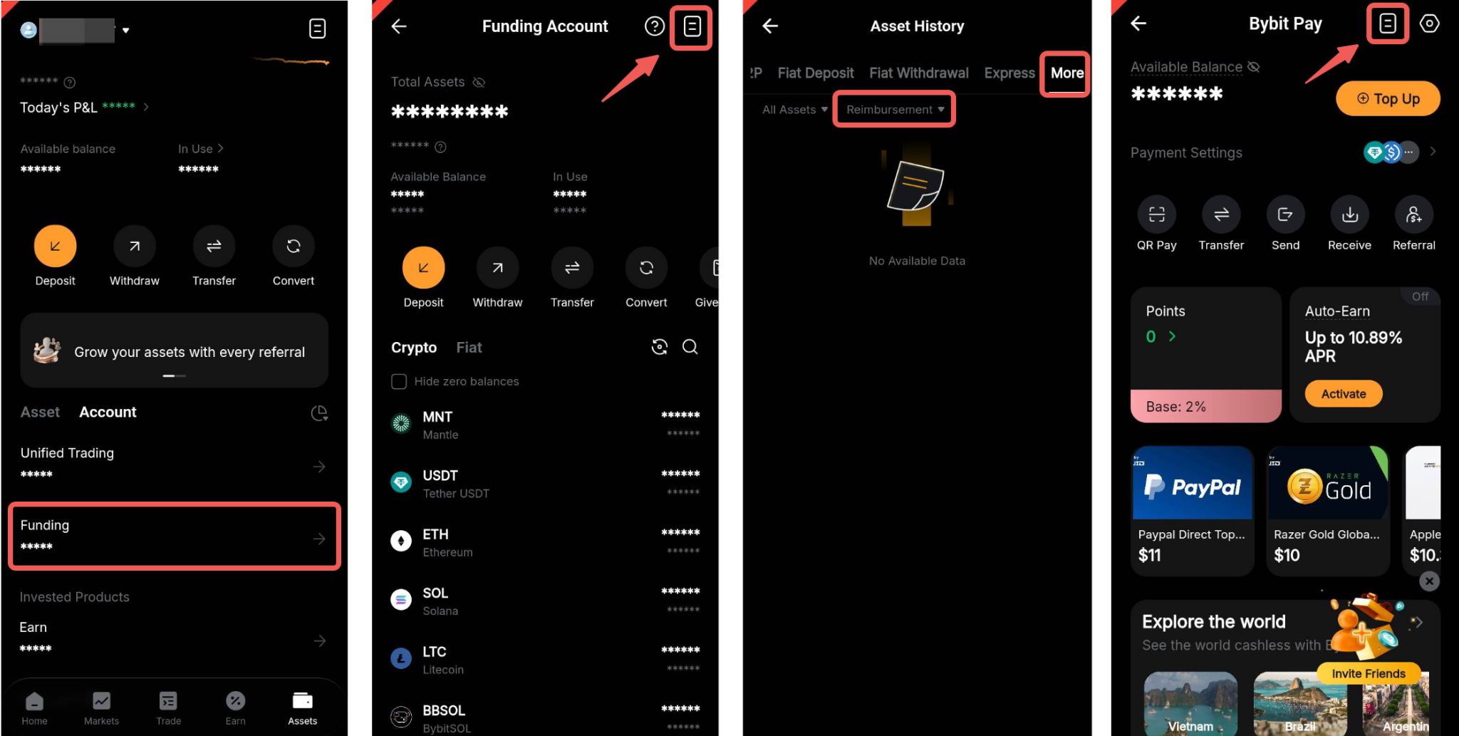 On the app, go to Assets → Funding account → More, then filter the type to Bybit Pay Kazakhstan. Alternatively, you may go to the Bybit Pay Kazakhstan page and tap on the Paper icon in the top right corner.