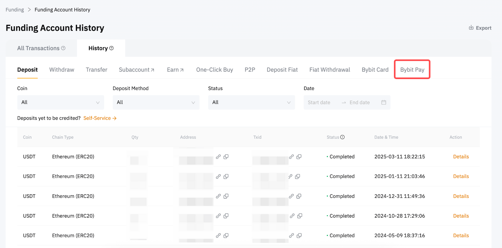On the website, go to the Bybit Pay Kazakhstan page, scroll down to the bottom to find the Recent Transactions, and click View All. Alternatively, you may find the transaction history by going to the Funding account →History → Bybit Pay Kazakhstan.