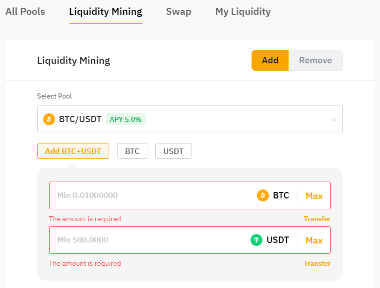 Assuming Trader A adds 30,000 USDT to the BTC/USDT liquidity pool while the price of BTC is 30,000 USDT. the system will automatically rebalance the principal into equal value to the liquidity pool. At this price, his liquidity value is 0.5 BTC and 15,000 USDT.