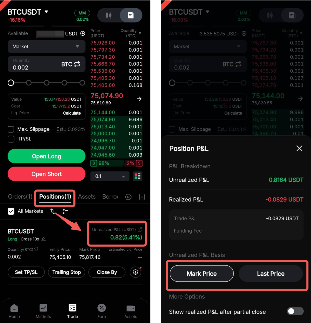 By default, the unrealized P&L is calculated based on the last traded price (LTP). You can hover over the Unrealized P&L field to view the value calculated using the Mark Price, which serves as the system's fair price reference for liquidation.