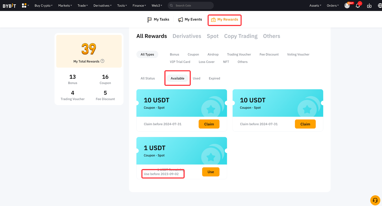 All claimed and unclaimed Coupons and Bonuses can be found on the My Rewards page. The Coupon and Bonus amounts are calculated based on the real-time exchange rate at the time of distribution.
