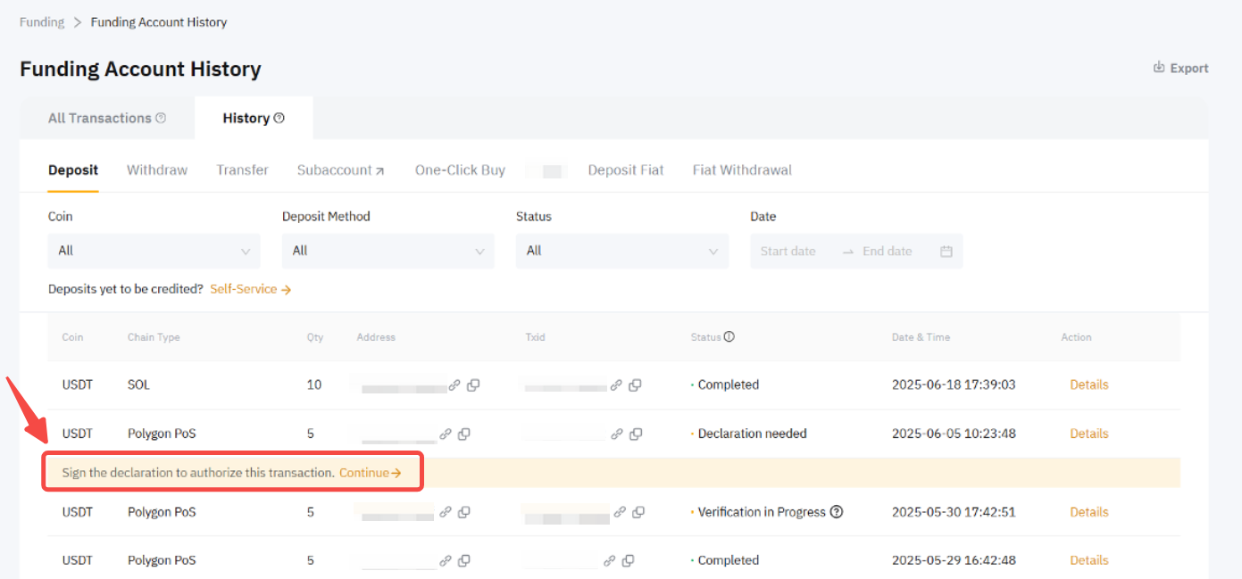 For deposits from the unhosted/cold wallet, you will need to complete both the wallet ownership verification and declaration form by opening the verification link on the Deposit Account History page.