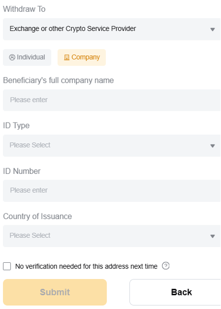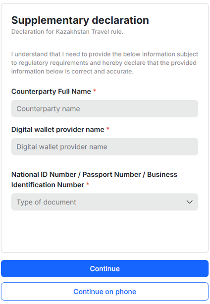 When initiating a withdrawal transaction, you will be prompted to complete the Travel Rule declaration as part of the transaction process.