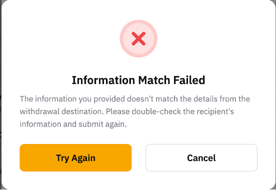 This is because the recipient information you provided does not match the details from the recipient's destination. Please ensure you fill in the correct information and submit your withdrawal request again.