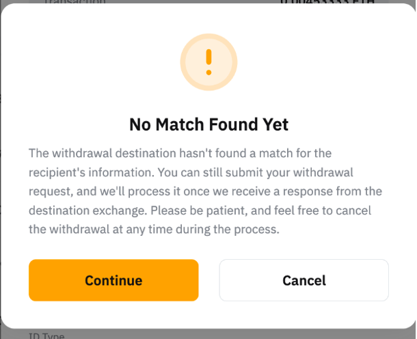This can happen when the deposit or withdrawal destination has not found a match for the originator or recipient information input. You can still submit your deposit/withdrawal request, and it will be processed once we receive a response from the counterparty DASP. You can cancel your withdrawal at any time during the process.