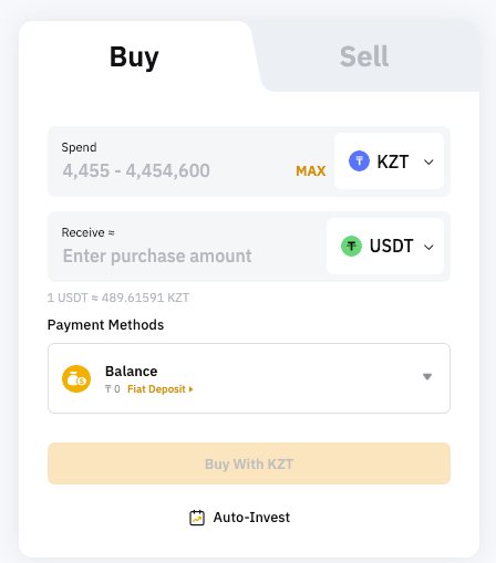 a. Select the fiat currency — KZT— that you wish to pay in.