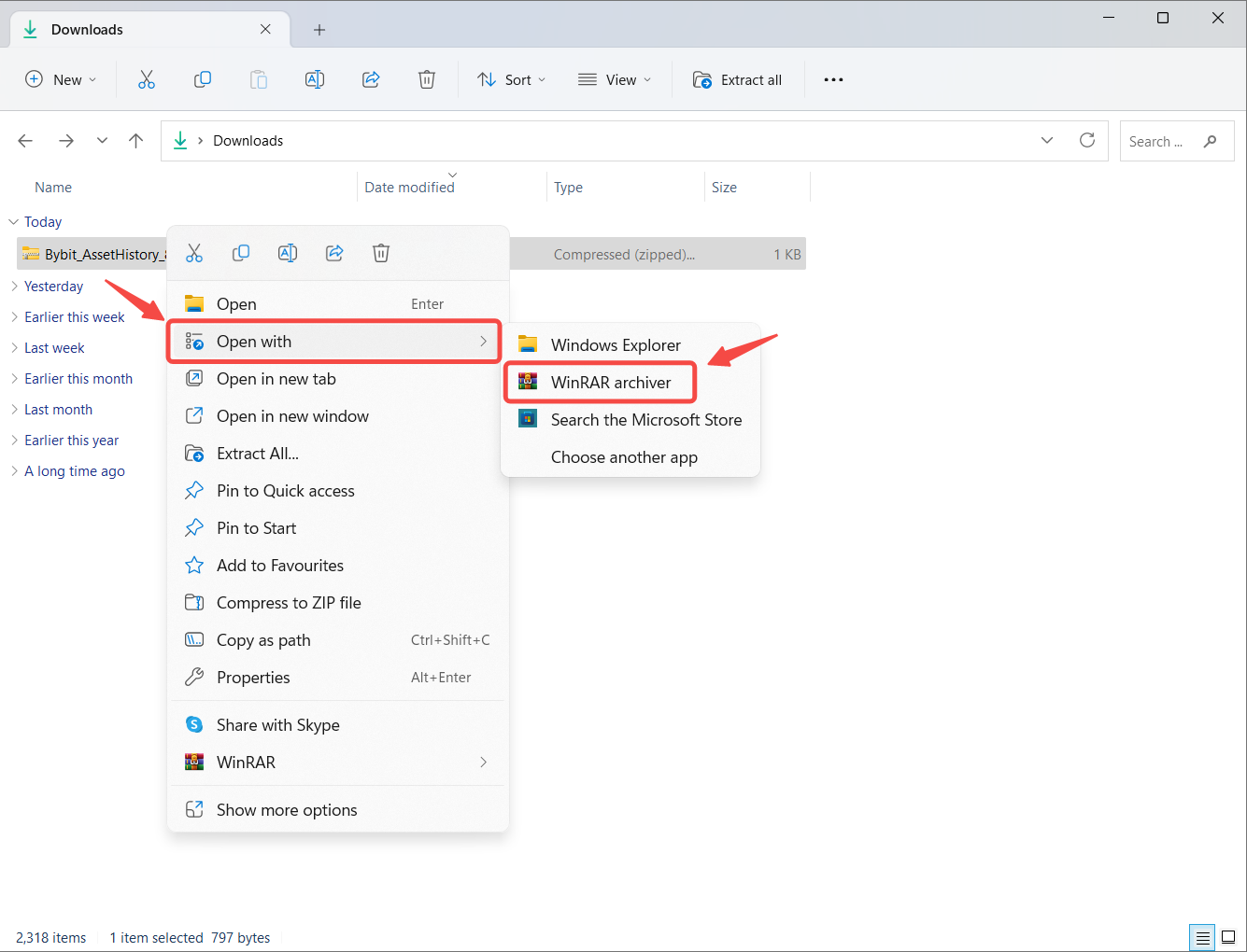 Step 1: Download the data export file from your Bybit Kazakhstan account and open the folder containing the file. Right-click on the file and select Open with → WinRAR archiver.