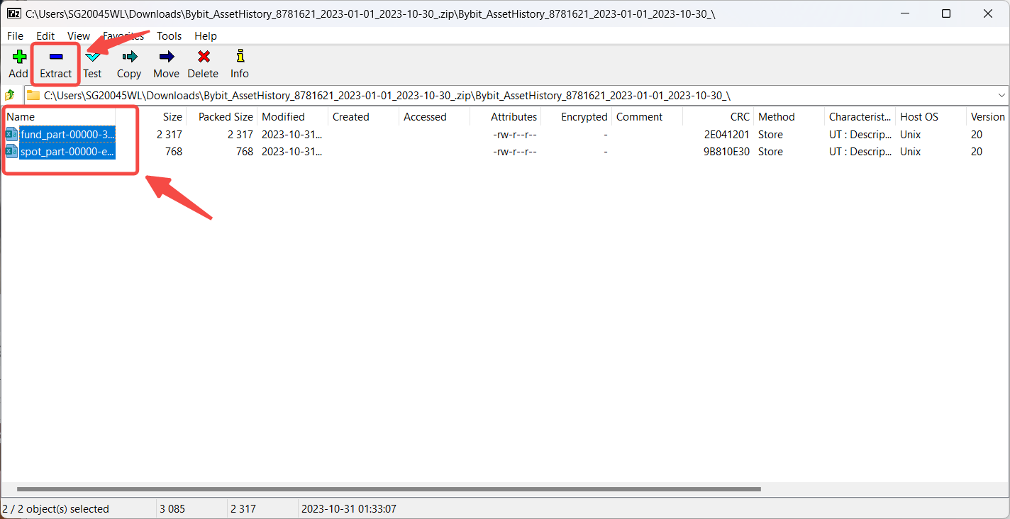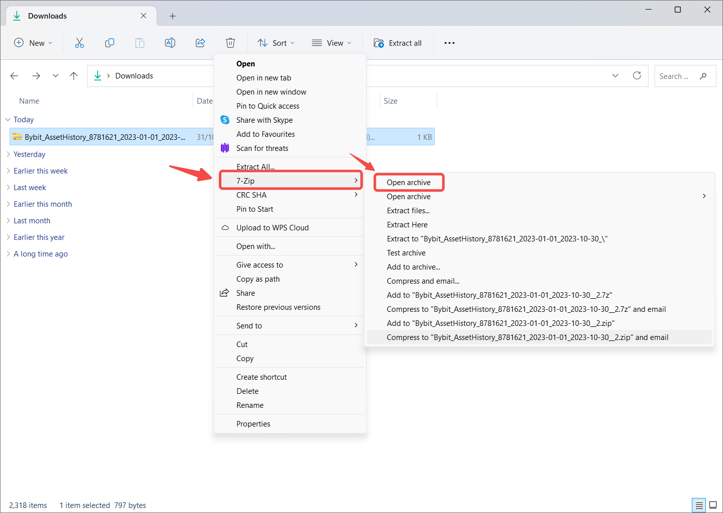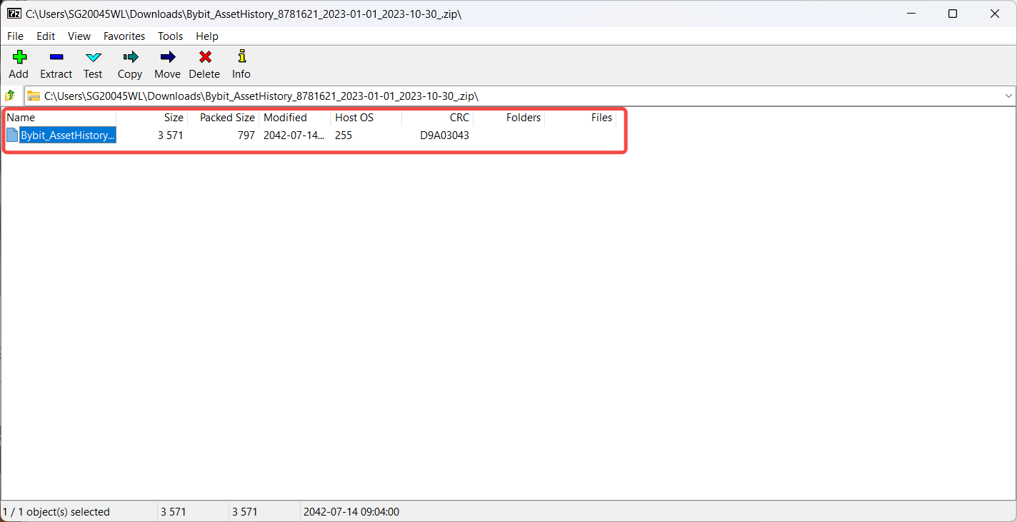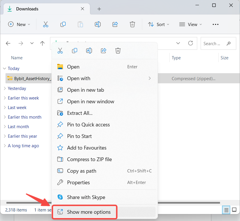 Step 1: Download the data export file from your Bybit Kazakhstan account and open the folder containing the file. Right-click on the file and select Show more options → 7-Zip → Open archive.