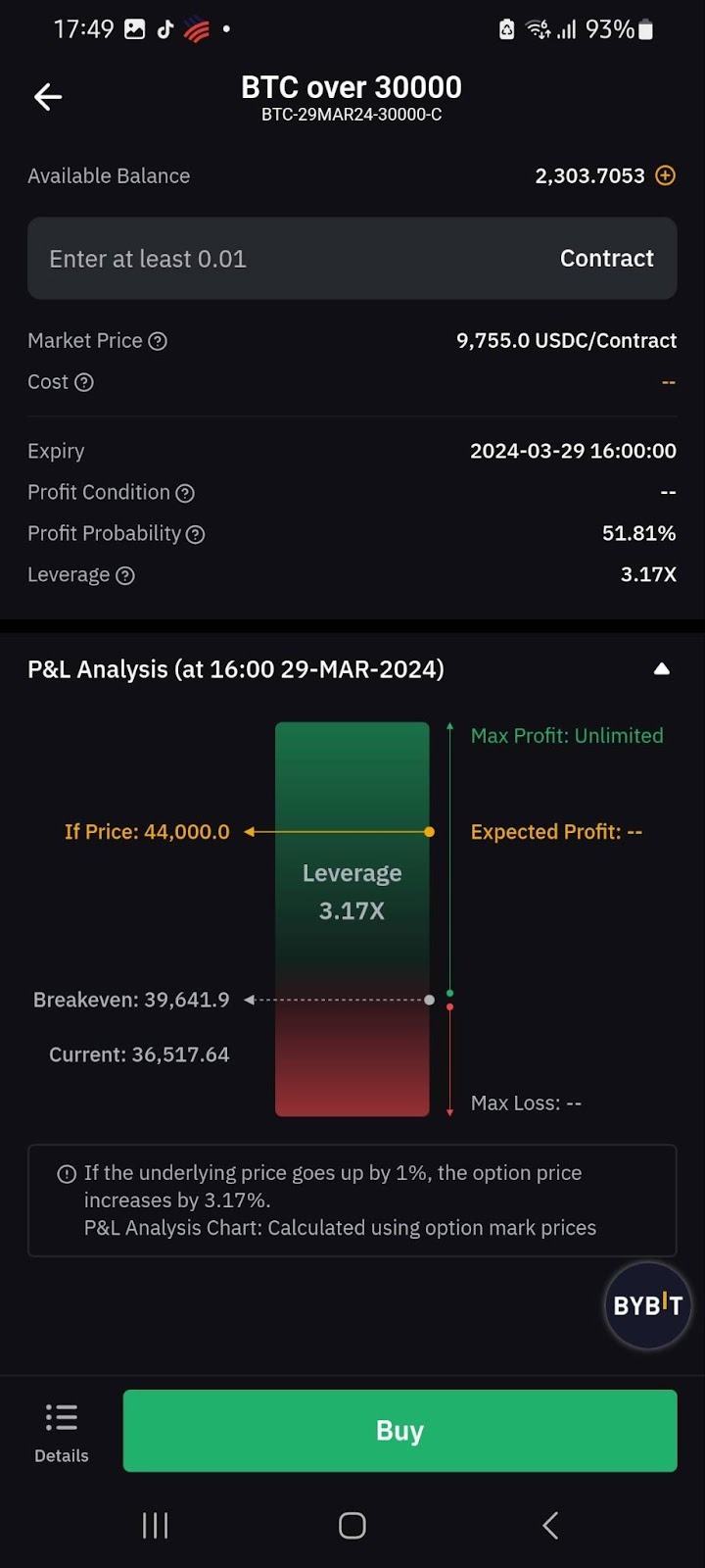 The P&L analysis chart below presents the current market price, the PnL simulated based on the Mark price, the breakeven point, and the optimal P&L situations under simulation. After reviewing the details, traders can tap Buy to purchase the contract.