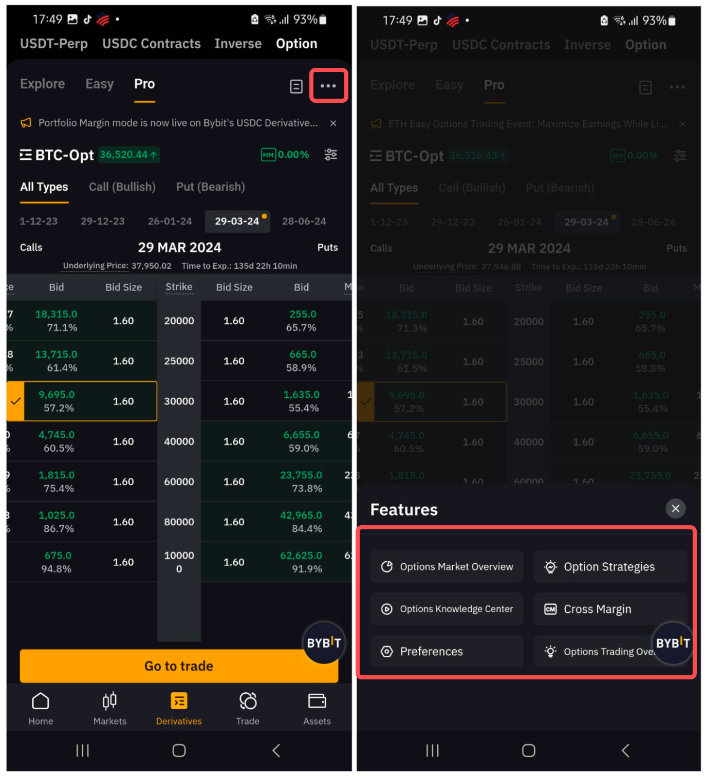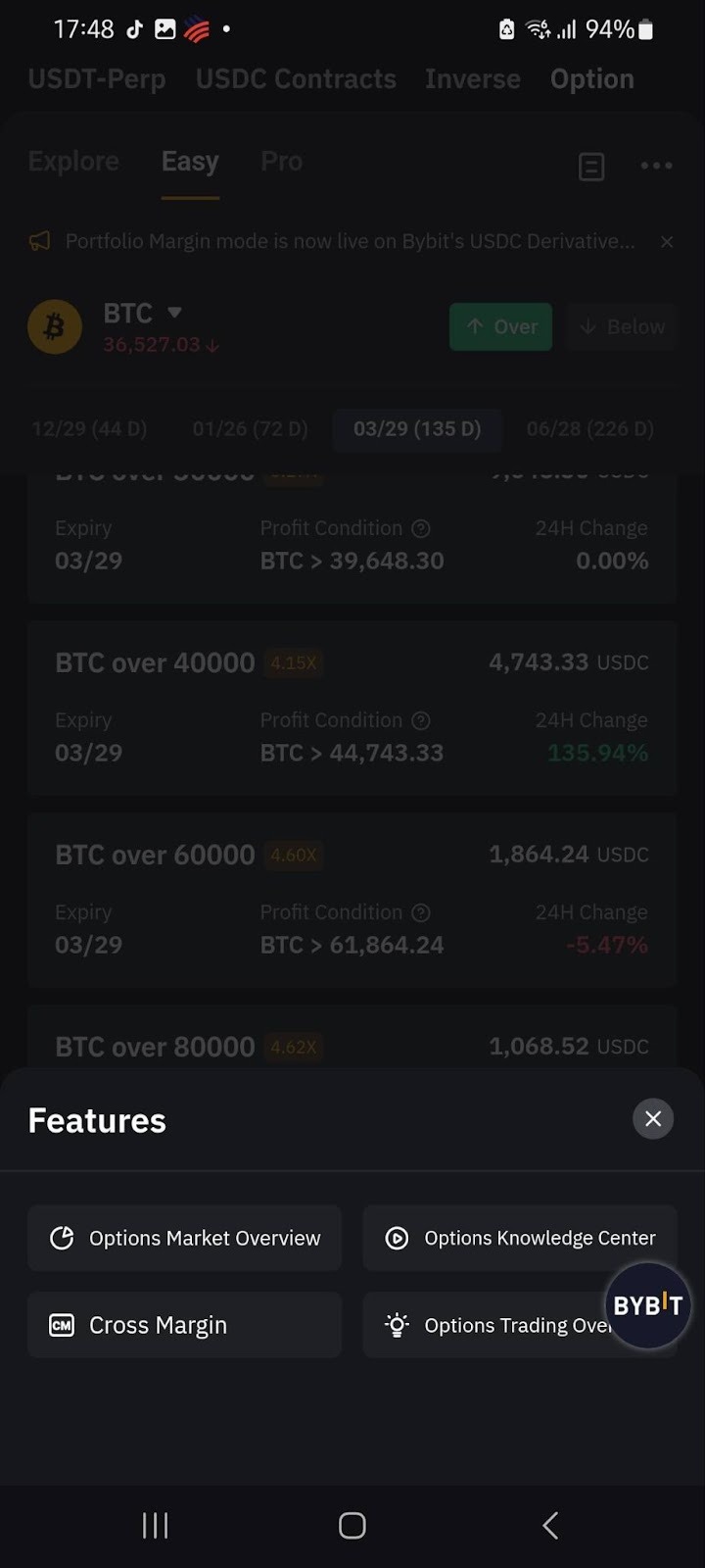 Traders can also access additional information such as Options Market Overview, Options Knowledge Base, or Options Trading Overview and switch to different margin modes by tapping the ellipsis.