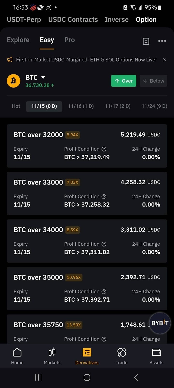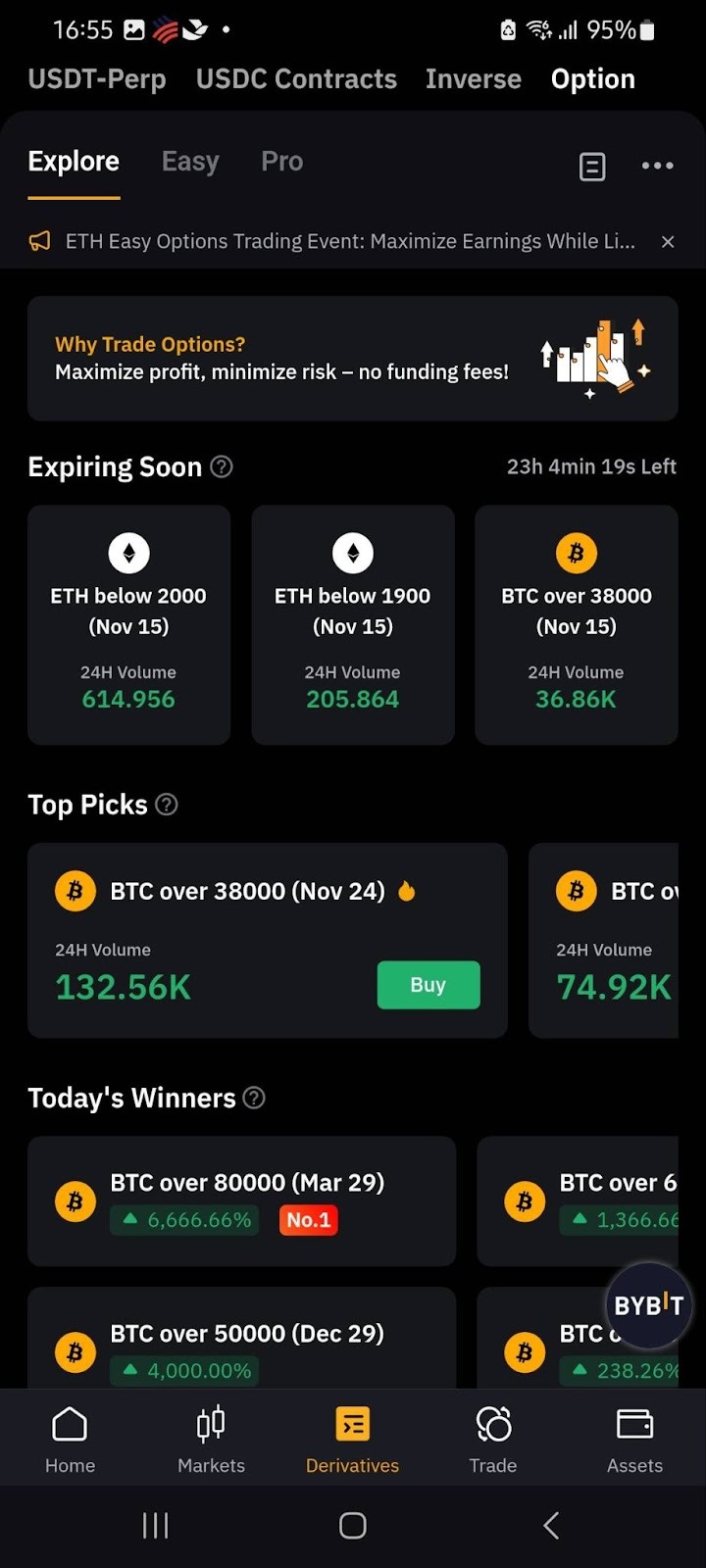 To access Bybit Kazakhstan Easy Options, first launch the Bybit Kazakhstan App. From the homepage, select Derivatives and tap on Option. This will take you to the Bybit Kazakhstan Options page, where you can then choose from three modes depending on your experience with options trading.