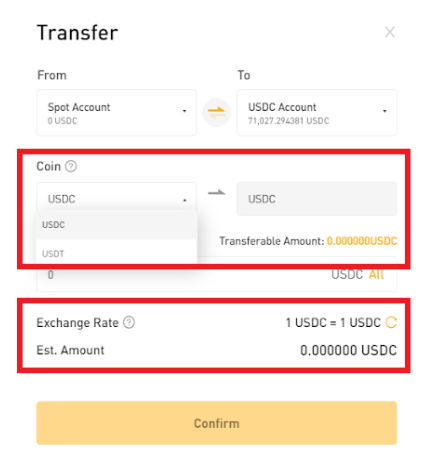 Step 3: On the Transfer page, in addition to USDC, you can convert the USDT in your Spot Account into USDC at the real-time exchange rate, and transfer directly to your USDC Account.
