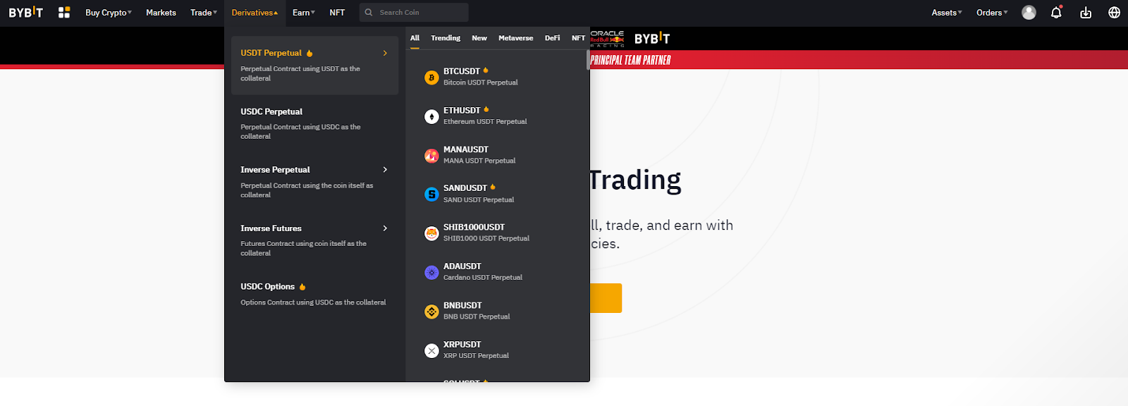 Step 1: Click on Assets at the top right-hand corner of the Bybit Kazakhstan home page. Then click USDC Derivatives.