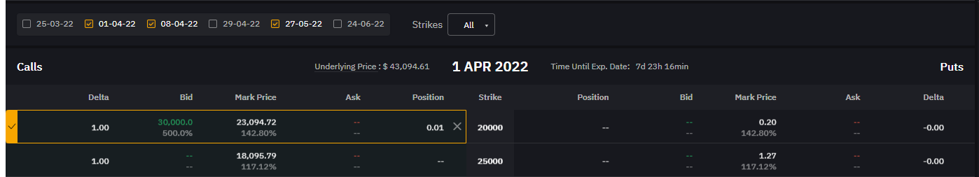 b. Options chain: Displays important market information related to the options contract that you’ve selected, including the Underlying Price, Strike Price, Delta, Mark Price, and more.