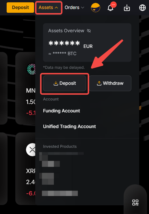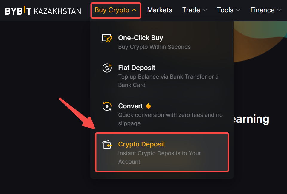 Alternatively, you may also hover your cursor over Assets at the top right-hand corner of the Bybit Kazakhstan homepage. Then, click on Deposit to enter the deposit page.