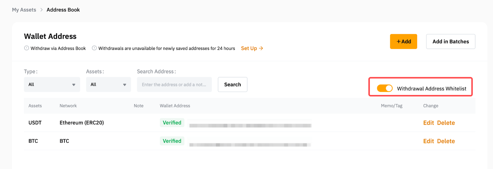 Step 5: Once the verification of the wallet address is done, please activate the Withdrawal Address Whitelist function on the top right corner of the page in order to whitelist the verified wallet address in your withdrawal function.