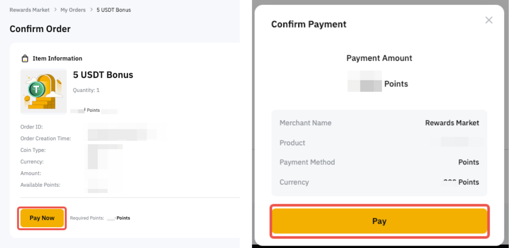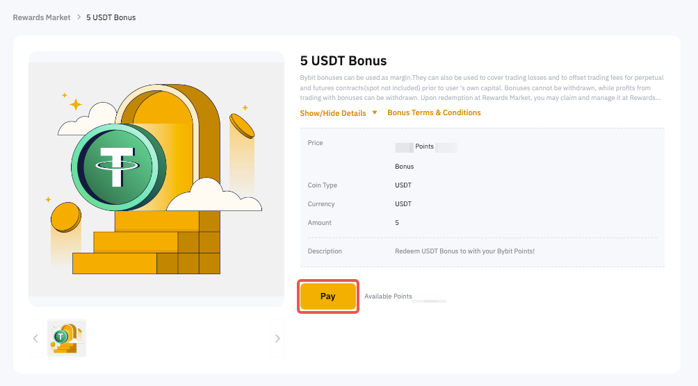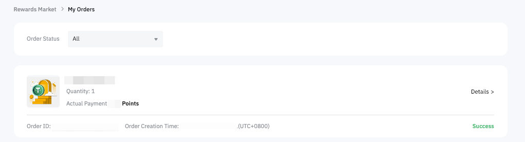 You can find your redemption status records on My Orders page. By clicking on Details, you can access all the information related to your redemption, including the order ID, creation time, completion time, coin type, currency, bonus amount, and point payment amount.