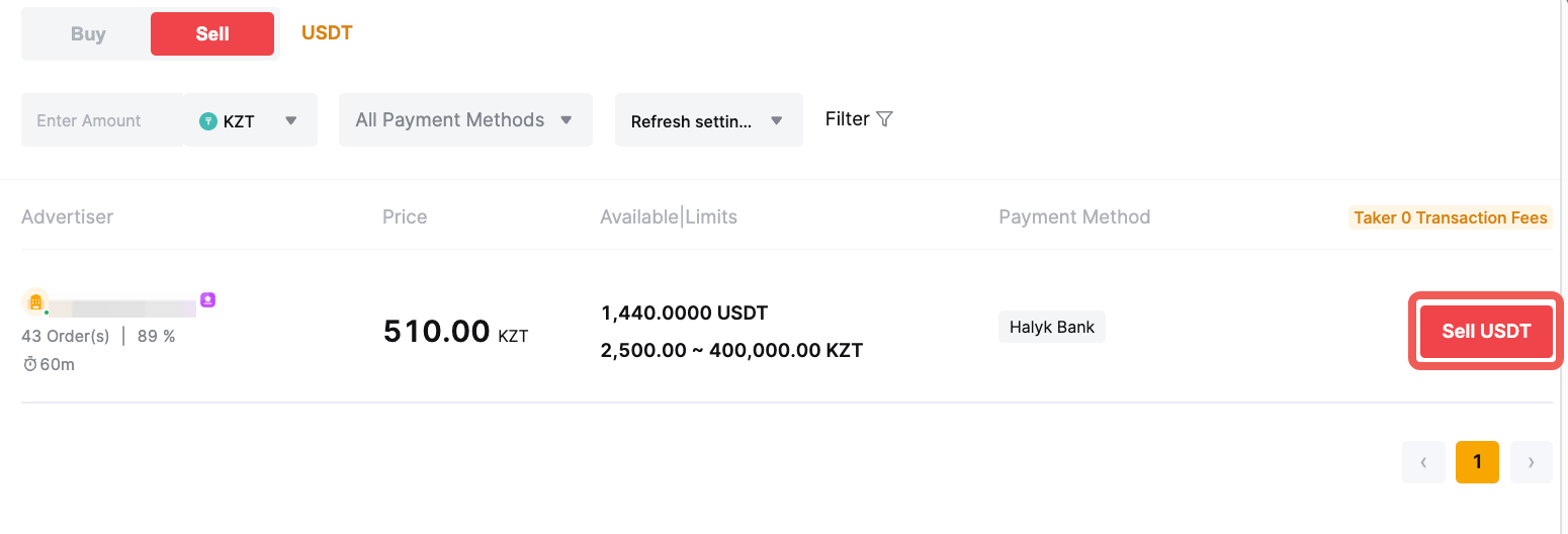 Step 3: Choose your preferred advertisement, and click on Sell USDT.