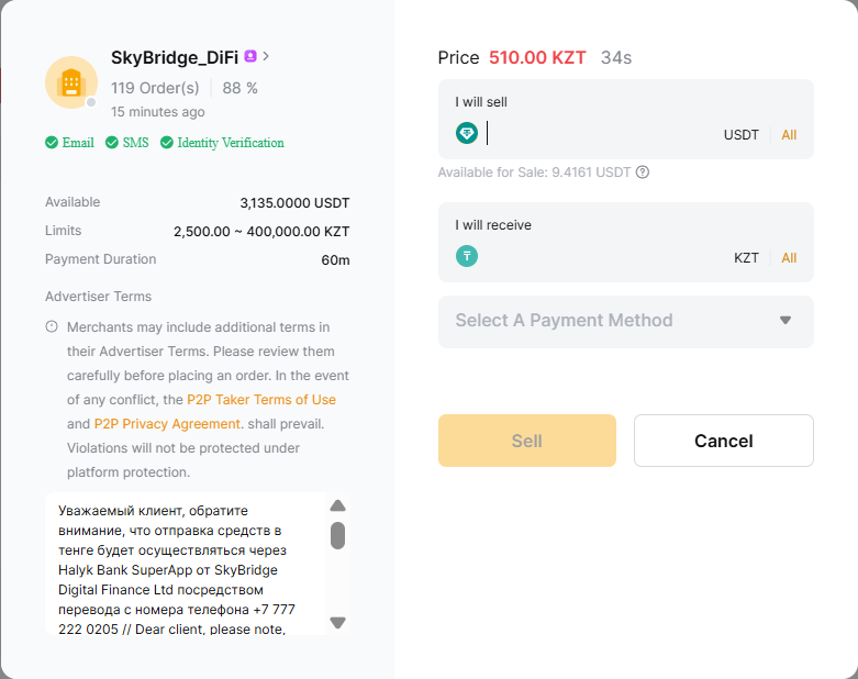 Note: At this time, only Halyk Bank is permitted as a payment method on P2P, and only Halyk Bank details can be added or used.