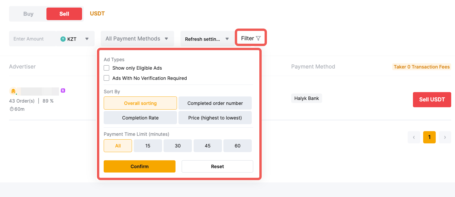 Step 2: On the Sell page, you can filter advertisers by entering your desired criteria for Coin Type, Amount, Fiat Currencies, Payment Methods, and more, based on your transaction needs.