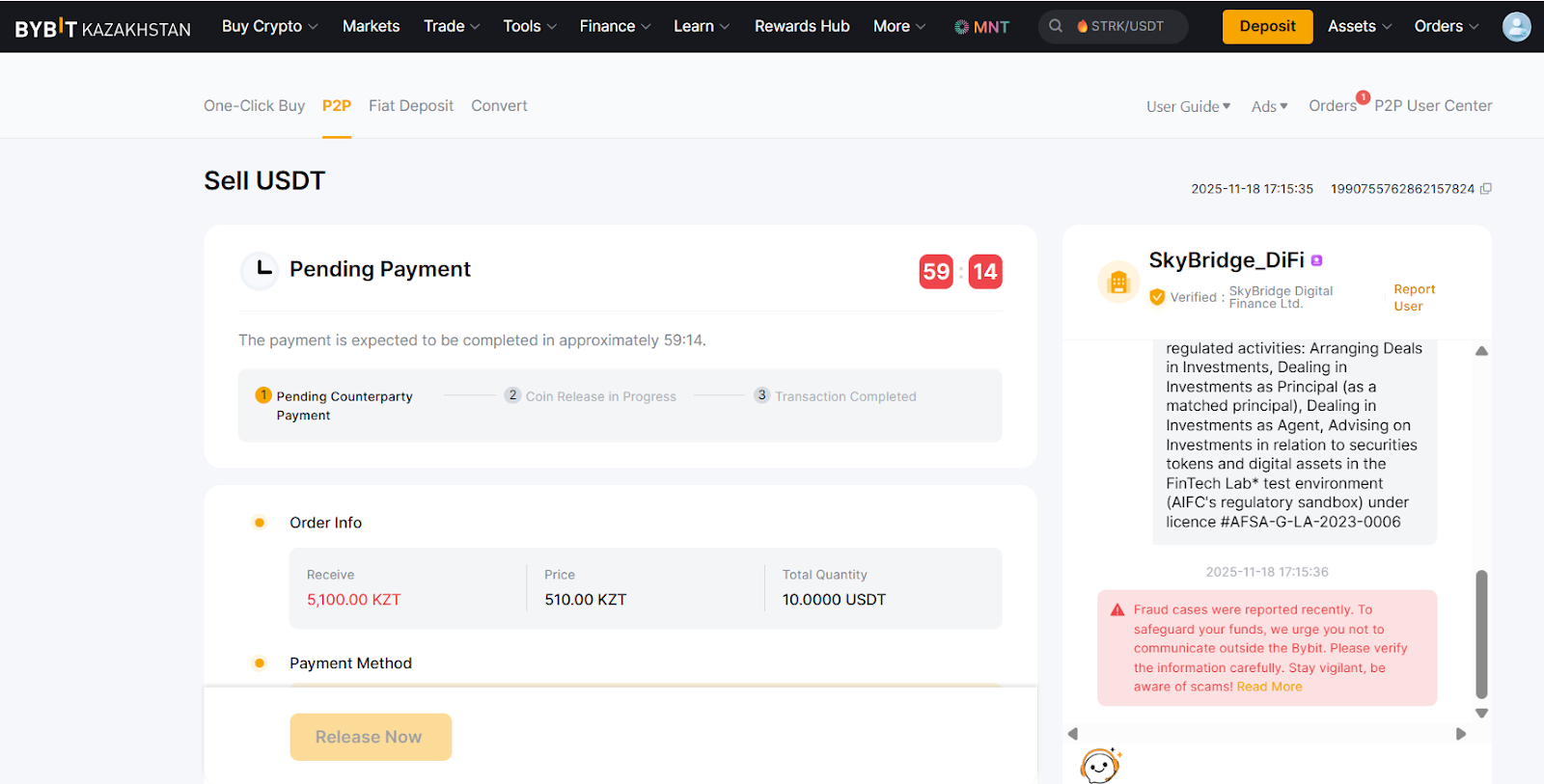 - P2P transactions are processed only through the Funding Account. Before starting a transaction, make sure your USDT is stored in your Bybit Kazakhstan Funding Account.