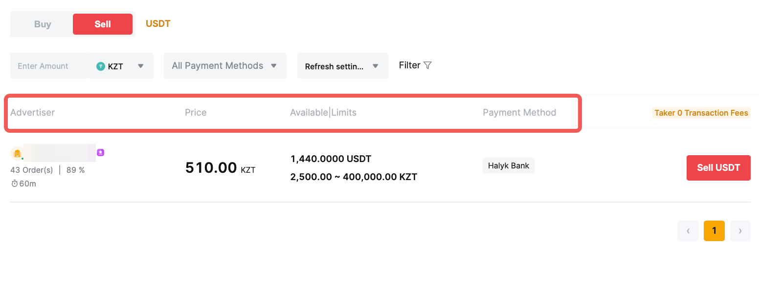 — The Available/Limits column displays the available balance for each advertisement as well as the minimum and maximum transaction limits per order, in fiat terms.