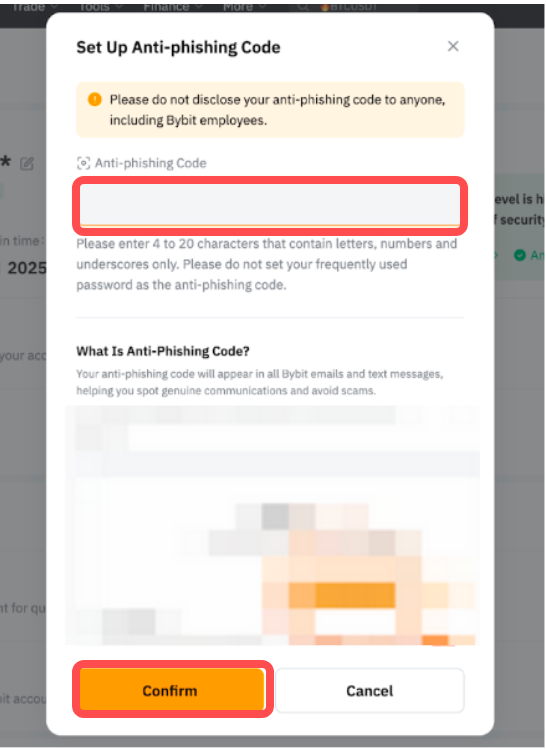 Step 3: Next, enter your desired Anti-phishing Code and click on the Confirm button.