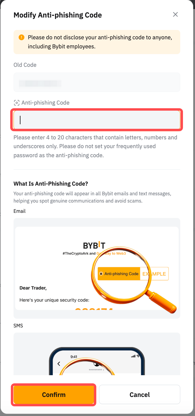 Enter your new desired Anti-phishing Code and click on the Confirm button.