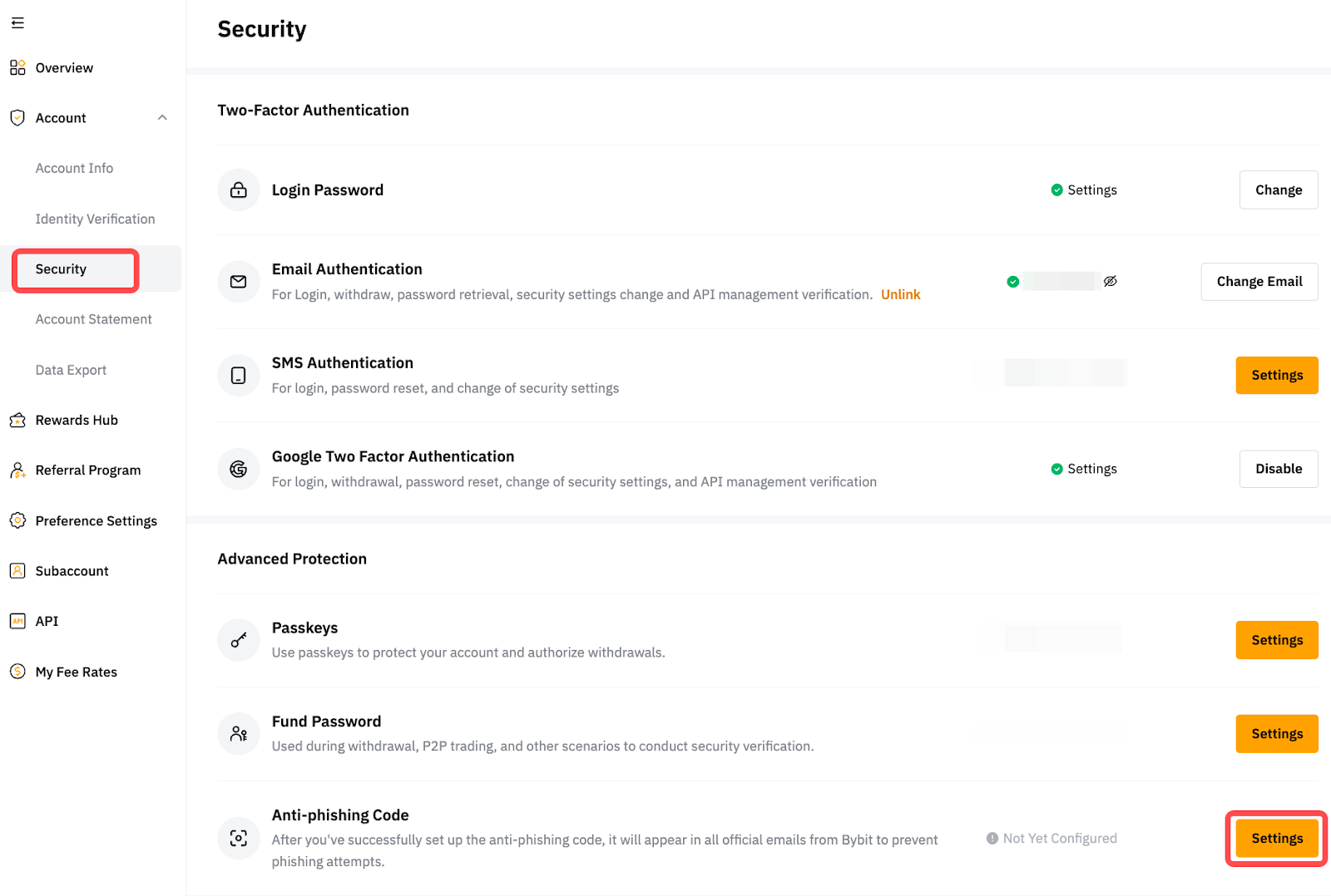 Alternatively, tap on Security and click on the Settings button under the Anti-phishing Code configuration.