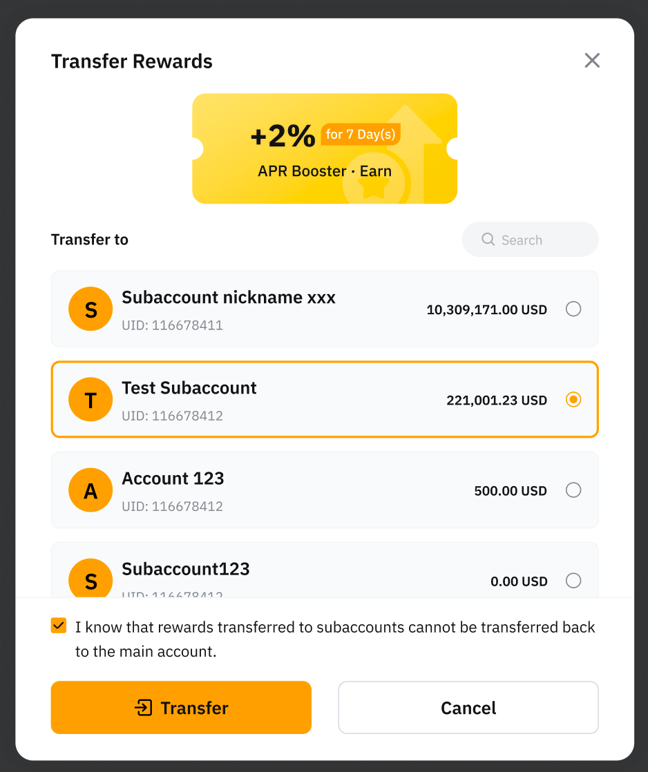 — Once the rewards are transferred to your Subaccount, they cannot be transferred back to the Main Account or to other Subaccounts. Ensure you select the correct reward and Subaccount before confirming the transfer.