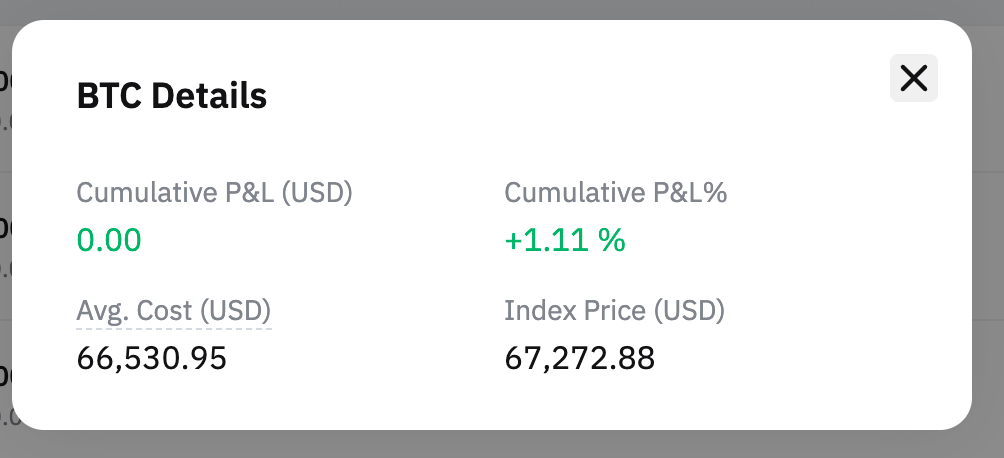 From the asset overview, you can see your current asset holdings and its average cost. By clicking the Details, you can view additional key metrics such as Cumulative P&L (USD), Cumulative P&L (%) and the current Index Price of the assets.