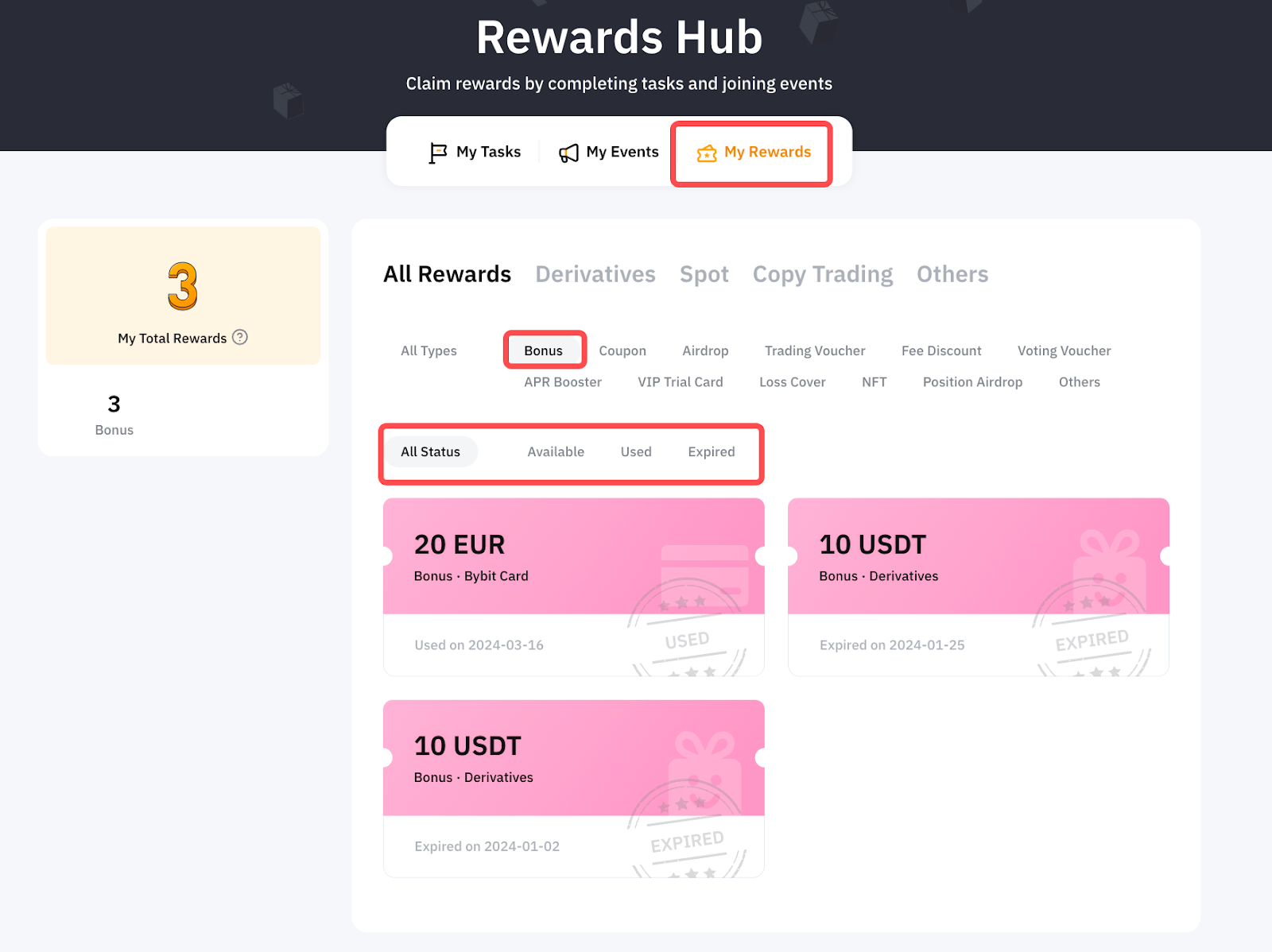 Step 3: To view the claimed rewards details, go to My Rewards and select the Bonus to check all claimed Bonus.