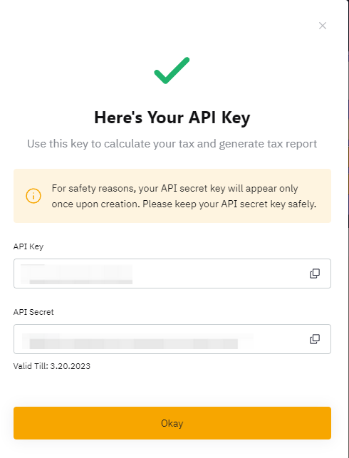 You have successfully created your Tax API Key! Please note that the API Key will expire after three months and you can create a new API Key.